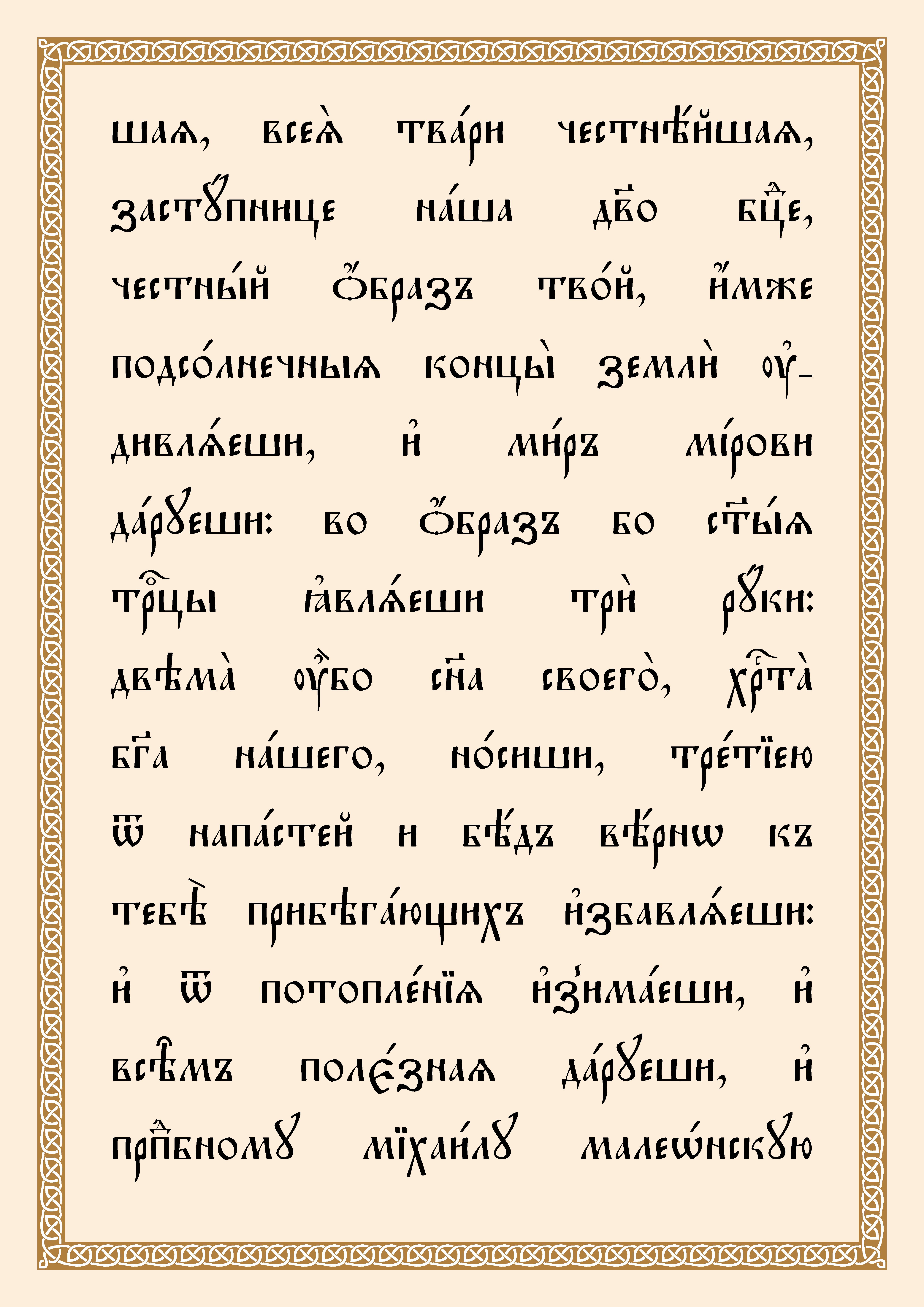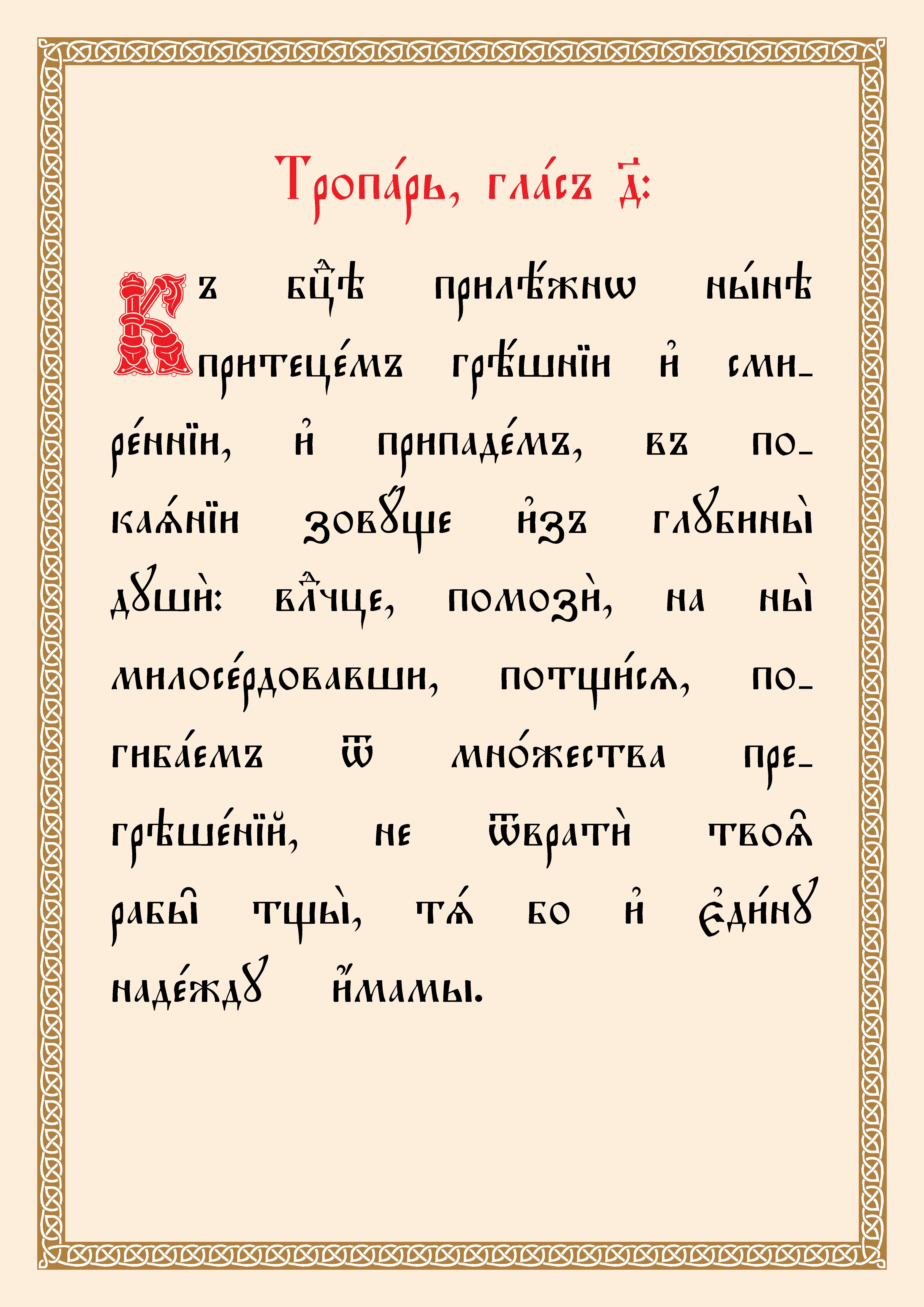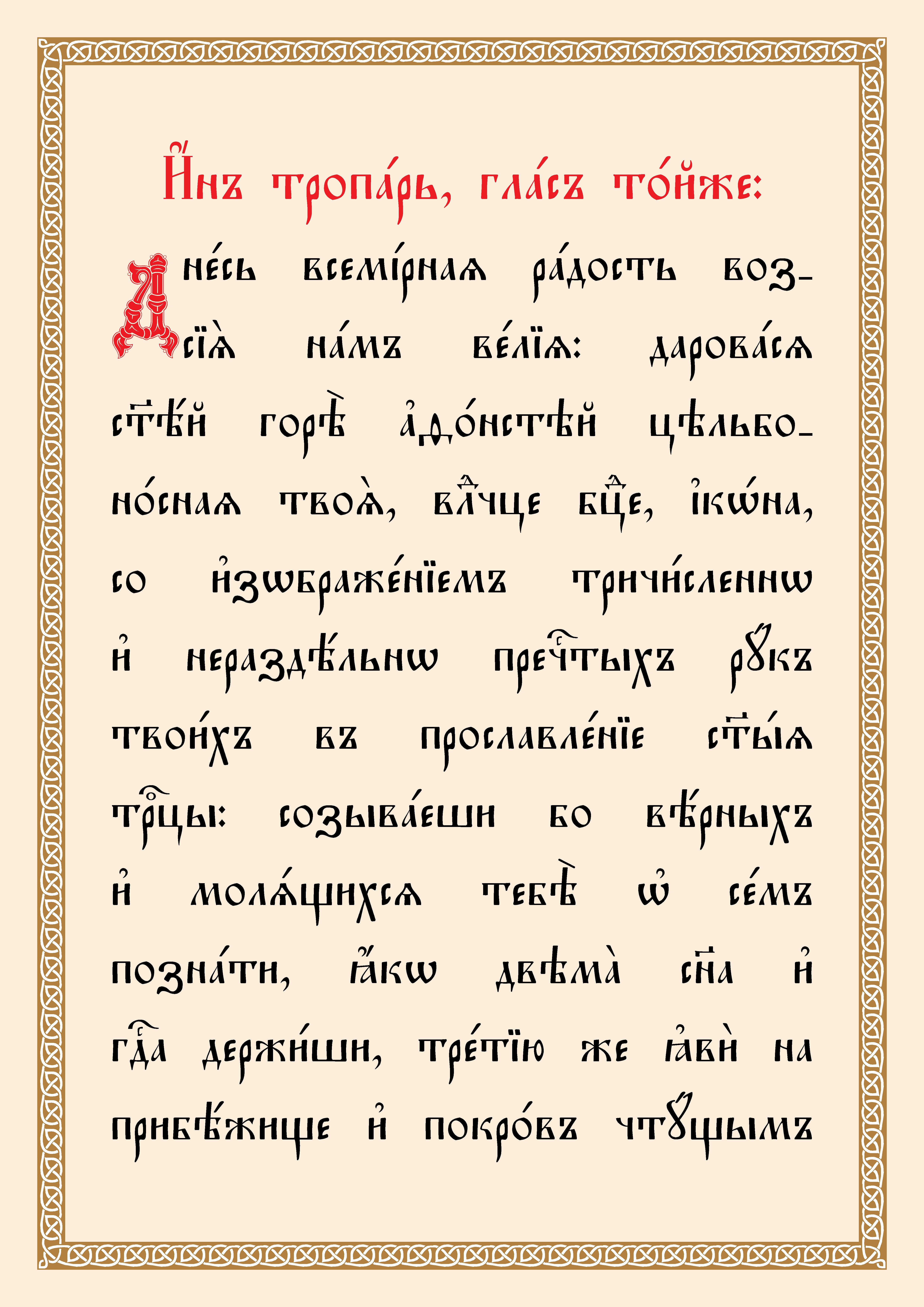 (Текст тропарей иконе Божией Матери Троеручице переведен из русской транскрипции на церковнославянскую орфографию).