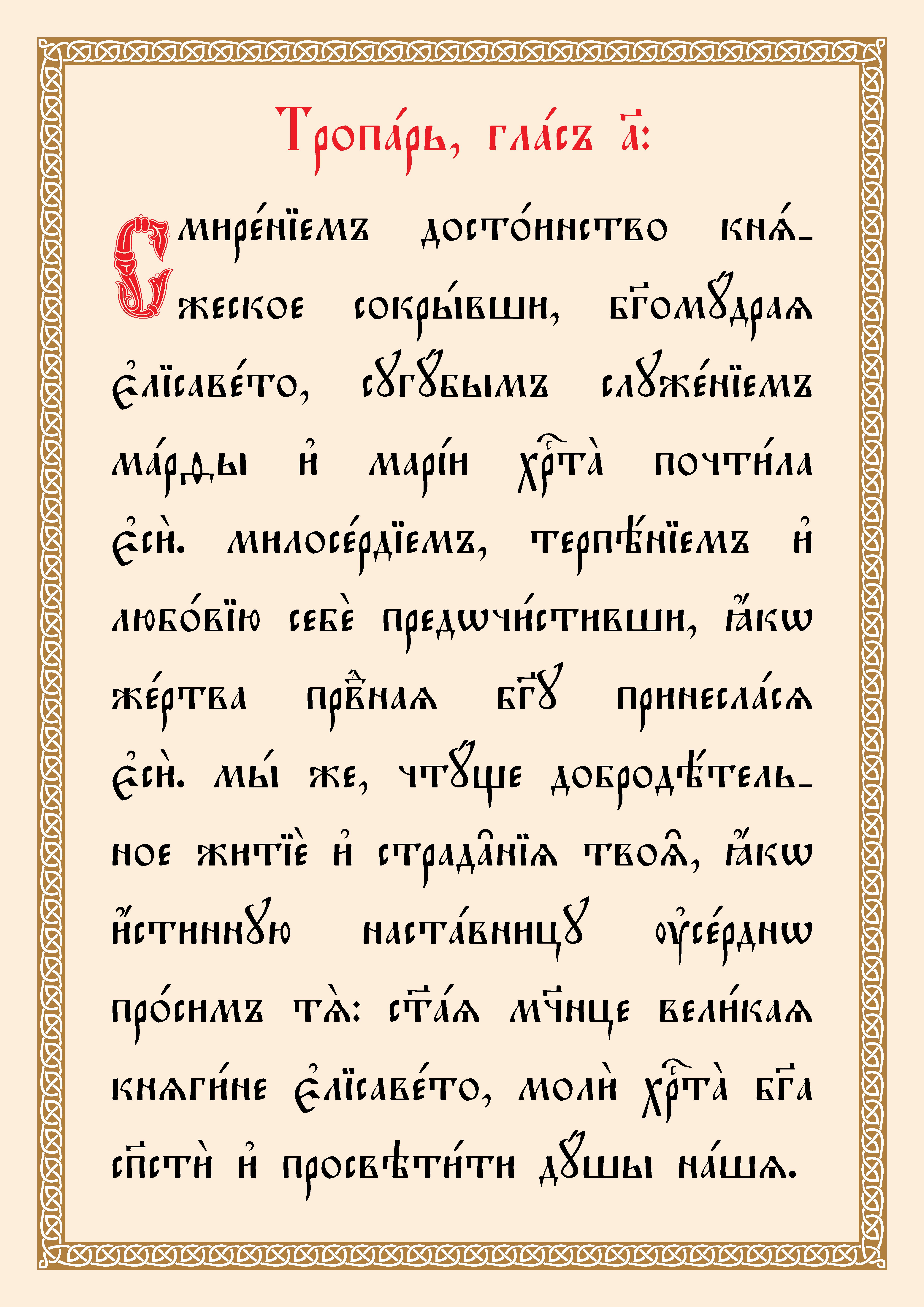 5 (18) июля. Тропарь, кондак, величание преподобномученице Великой Княгине Елисавете